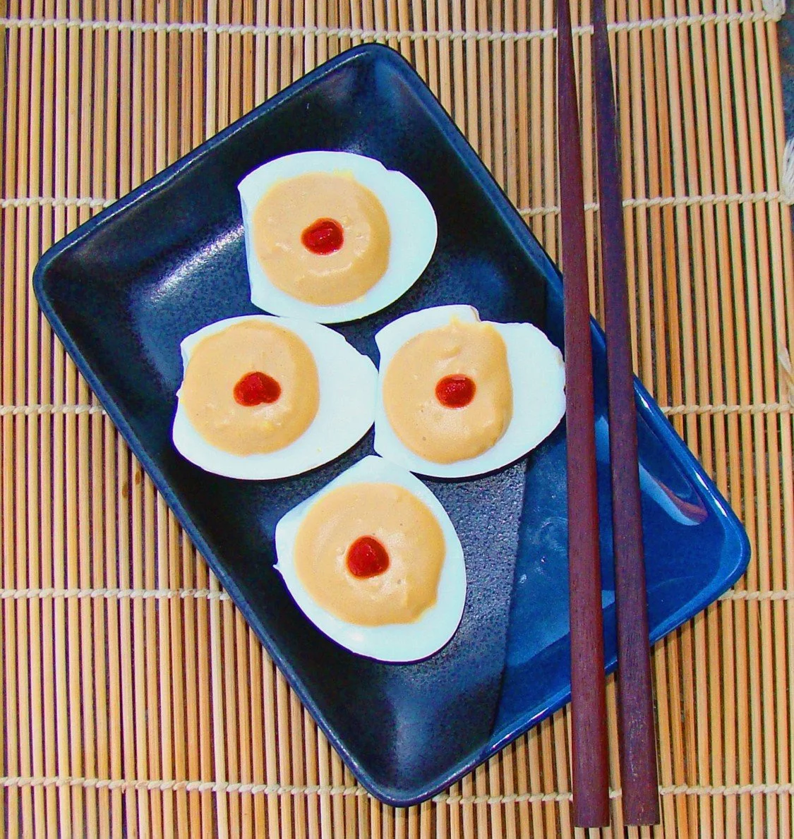1 Place the eggs in a pot and cover with cold water until they are submerged at least an inch. Bring to a boil over Medium Heat. Once boiling, cover and turn off the heat. Let sit for 6 mins. 2 Mix the Japanese Mayo and the soy sauce together and set aside in the fridge. (Japanese Mayo is thicker and richer than traditional Western mayonnaise. You can use any mayo in a pinch, but once you try Japanese Mayo, you’ll never switch back.) 3 Remove the eggs and place them into a large bowl filled with ice and water. Let the eggs sit in the ice water for 5 mins. This ice bath will “shock” them and stop them from overcooking. To make them easier to peel, remove them from their bath and let them come up to room temp. 4 Peel the eggs. If the shell sticks to the egg, or you pull chunks of the egg away with the shell, then you are a terrible cook and should throw everything out and start over. Or, on second thought, welcome to a not-so-exclusive club. I’ve found that the hardest thing to cook, seems to be an egg. But as long as they taste good, don’t sweat the appearance. 5 Once peeled, slice the eggs in half lengthwise and gently remove the yolks without damaging the whites. The yolks should be yellow – not grey. If the yolk is grey then the eggs are over-cooked. Nothing you can do about this now, but you can reduce your time for your next attempt. 6 Add all of the yolks to the mayo soy sauce mixture. Whisk everything together until it is smooth and creamy. Scoop a spoonful (about a Tbs) of the yolk mixture back into the egg-white halves. Finish by garnishing with a small drop of sriracha onto the top of each egg.